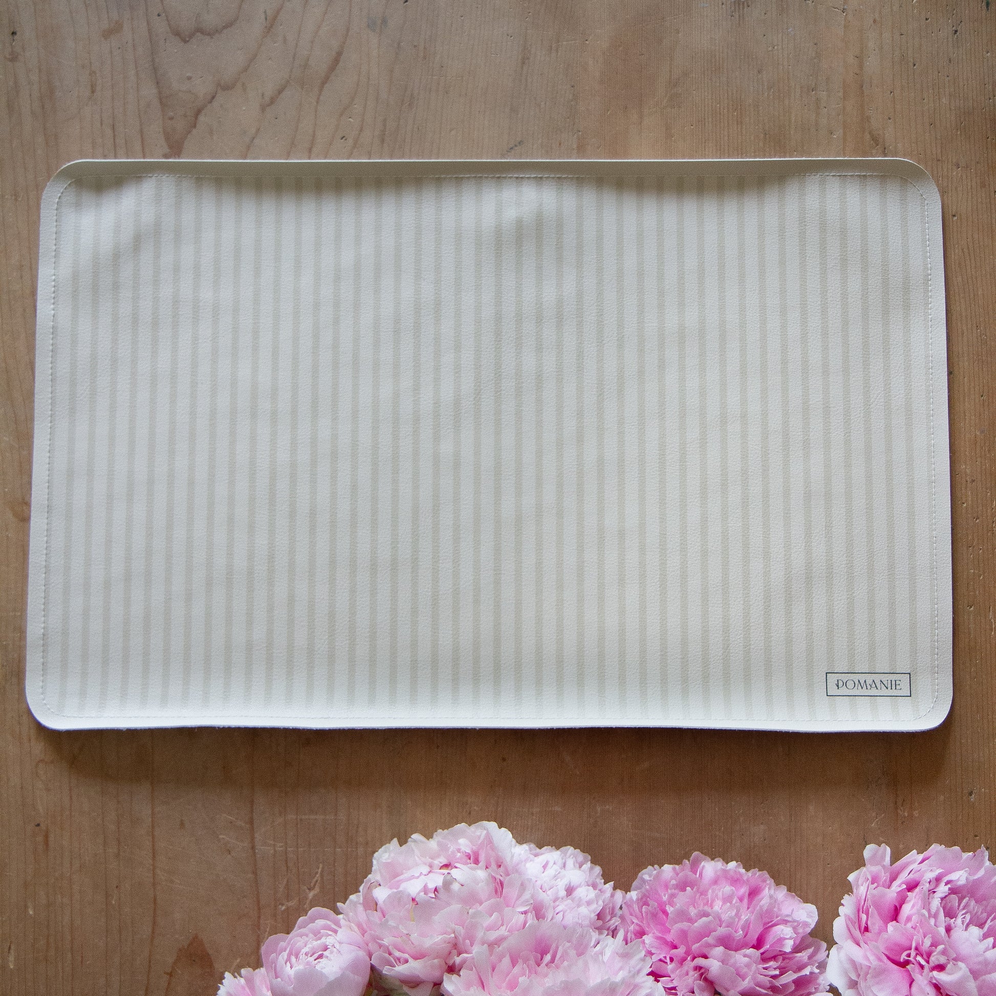 Fonctionnel et raffiné, il s’utilise aussi bien en intérieur qu’en extérieur. Sa face supérieure imperméable se nettoie d’un simple coup d’éponge, tandis que son revers antidérapant assure une parfaite stabilité, sur tout type de surface. Il se plie facilement, reste compact une fois replié, et peut même se suspendre grâce à ses accroches discrètes.